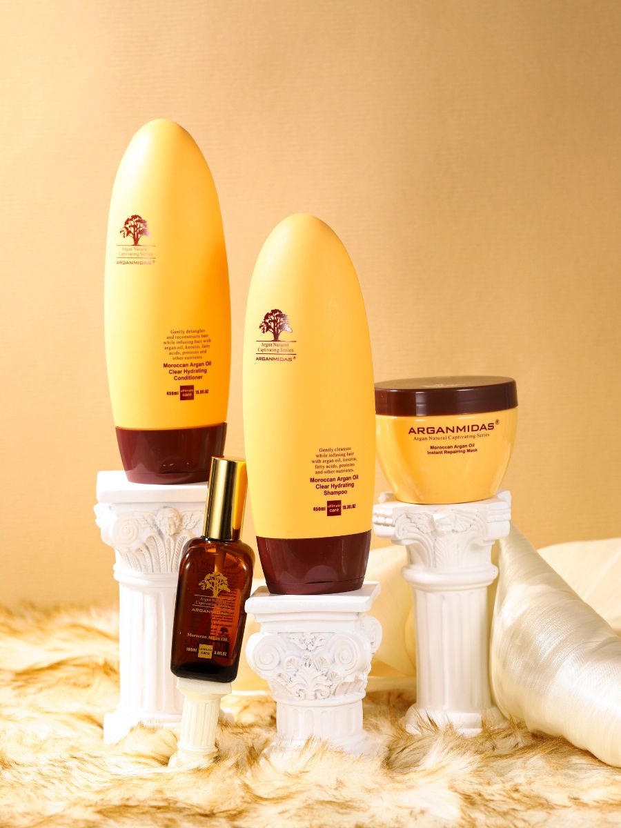 After years of exploration and research, our professional hair care brand Arganmidas was born. In order to stand out from competitors' brands, Arganmidas focuses on making high-quality hair care products. The brand uses the award-winning miracle oil -- Argan oil as basic formulation, and all products use high-standard raw materials; its appearance, by applying Argan nut as the prototype, is creatively moulded into a twisted waist bottle which has been patented; Its fragrance is exotic, pleasant and memorable, conjuring an experience of an unique sensory journey.